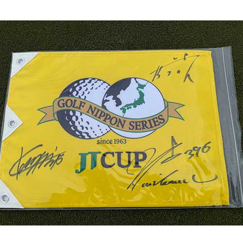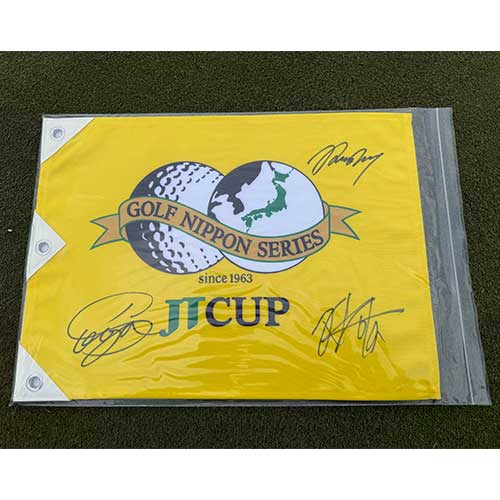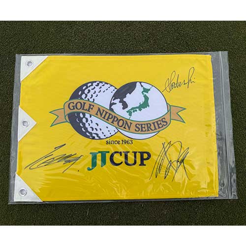 出場選手3名のサイン入りフラッグ(金谷選手、中島選手、原選手)